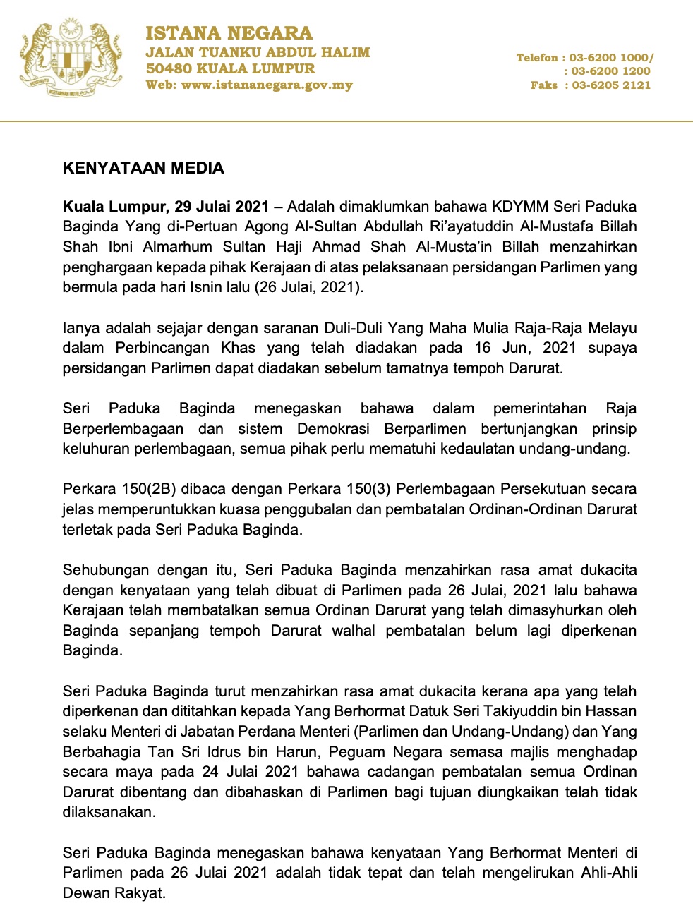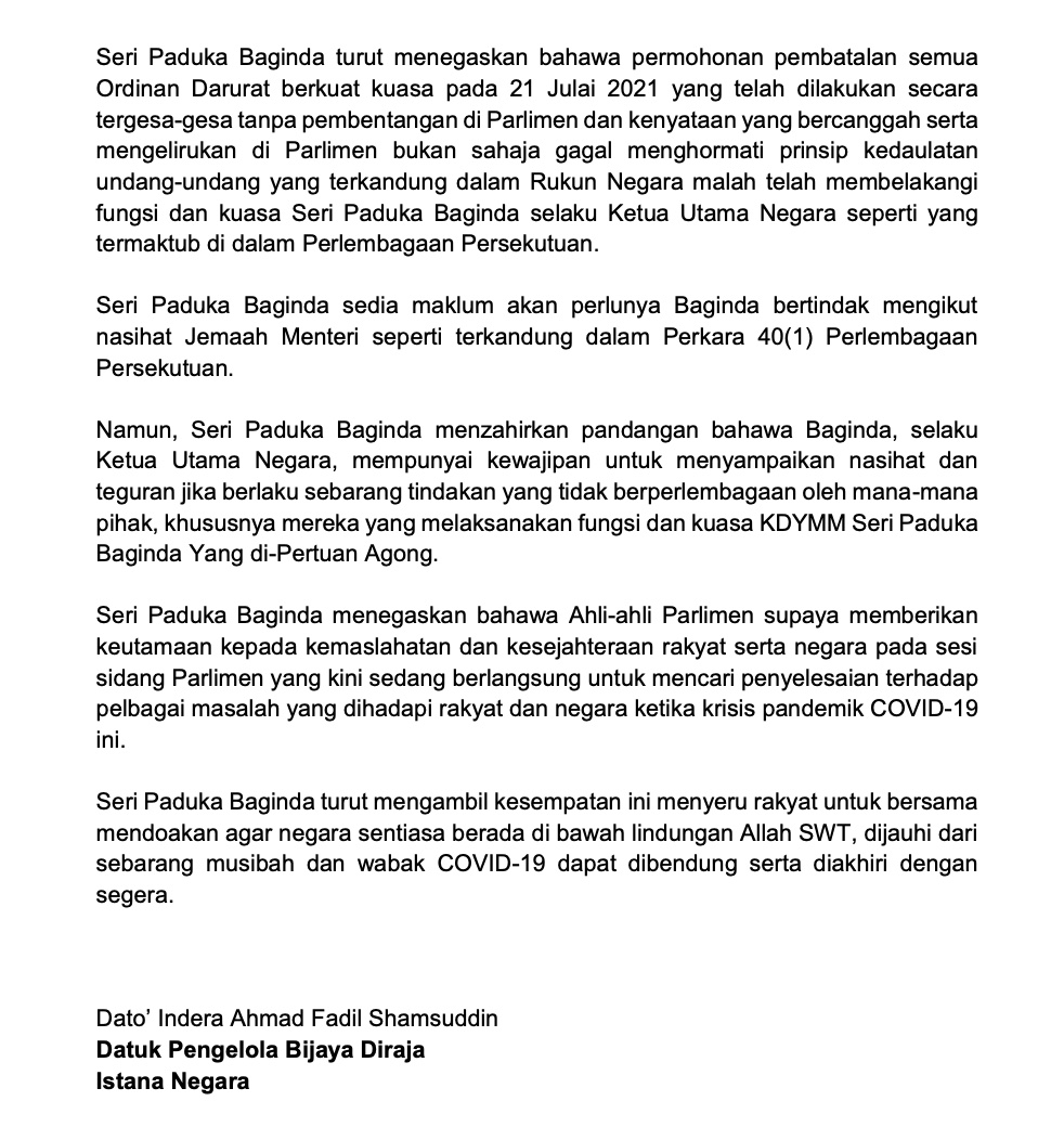 “Seri Paduka Baginda menzahirkan rasa amat dukacita dengan kenyataan yang telah dibuat di Parlimen pada 26 Julai, 2021 lalu bahawa Kerajaan telah membatalkan semua Ordinan Darurat yang telah dimasyhurkan oleh baginda sepanjang tempoh darurat walhal pembatalan belum lagi diperkenan baginda.”