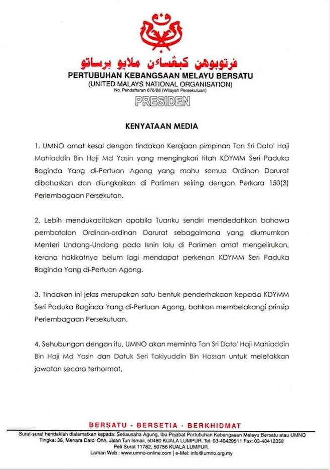 “Ini jelas apabila Kenyataan Media Istana Negara bertarikh 29 Julai 2021 telah membidas sikap biadap dan perlakuan derhaka oleh Yang Berhormat Datuk Seri Takiyuddin bin Hassan yang secara terang telah mengelirukan Dewan Rakyat.