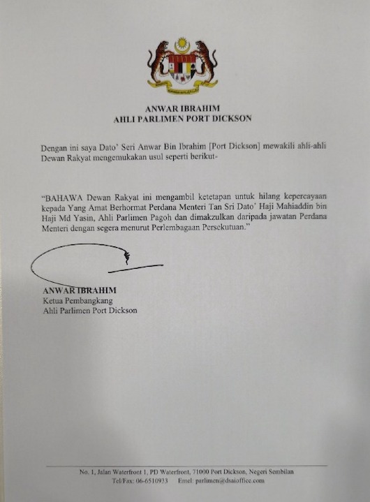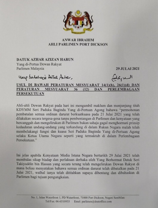Datuk Seri Anwar Ibrahim hari ini telah menghantar satu usul kepada Speaker Parlimen.