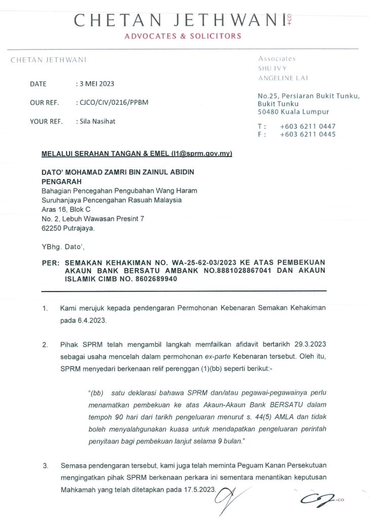 Bagaimanapun, pada 20.4.2023, SPRM mengeluarkan kenyataan media bahawa tanpa menunggu 17 Mei 2023, mereka telah memutuskan untuk merampas akaun bank BERSATU.